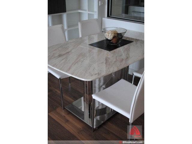 The condo is modern, fresh and has white walls, windows from floor to ceiling,