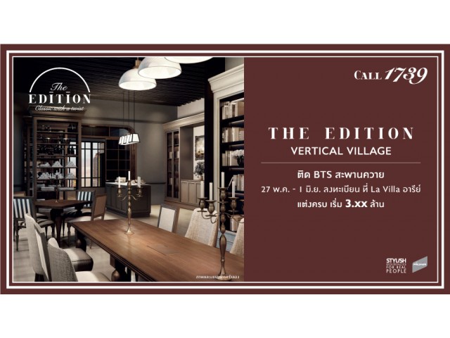 พฤกษา เตรียมเปิดคอนโดใหม่ ติด BTS สะพานควาย คอนโด High Rise ระดับ Premium โครงการ The Edition ( ดิ เอดิชั่น ) คอนโดมิเนียมติดรถไฟฟ้าสะพานควาย แต่งครบพร้อม Facility ระดับโรงแรม 5 ดาวในราคาเริ่มต้น 3.xx ล้านบาท โดยจะเปิดให้ลงทะเบียนตั้งแต่วันที่27 พ.ค. ถึง 1 มิ.ย. ที่ลาวิลล่าอารีย์ และเปิดให้จองในวันที่ 2มิ.ย ที่โรงแรม Siam Kempinski
