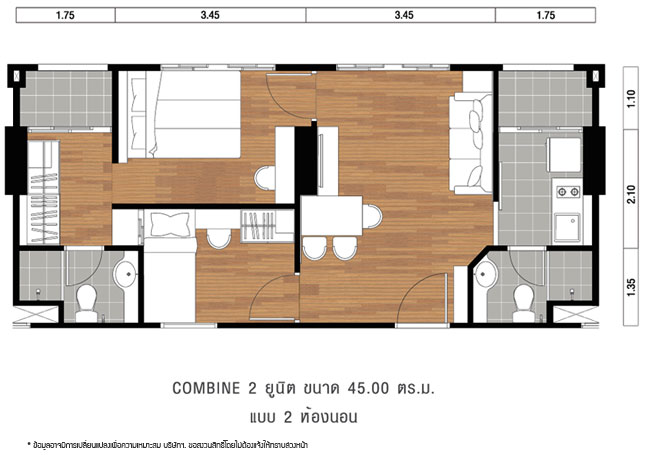 ข้อมูลห้องที่ขาย 2ห้องนอน2ห้องน้ำ ห้องA2301-A2302 อาคารAชั้น23 46 ตร.ม.