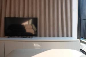 Nusasiri Grand ห้องมินิมอล ใช้โทนสีเรียบๆ ครบครันทั้งเไฟอร์นิเจอร์และเครื่องใช้ไฟฟ้า เช่าราคาดี