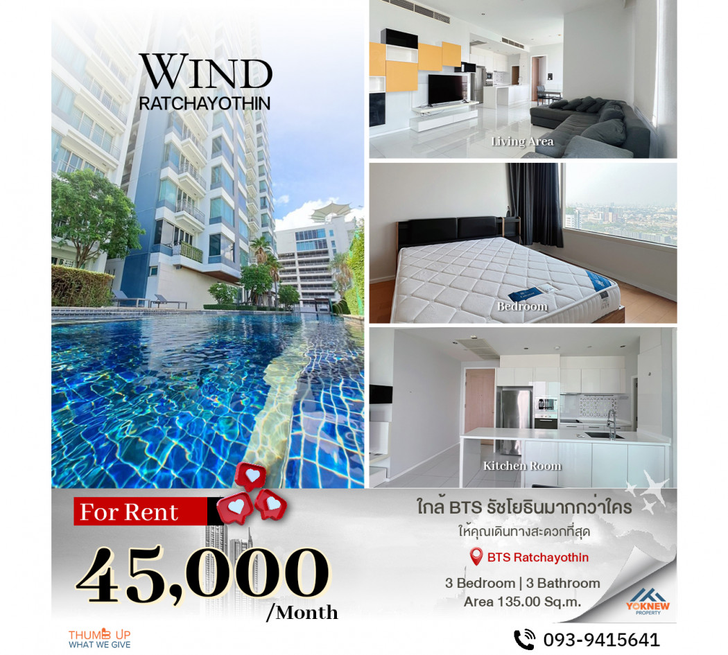 เช่าด่วน Wind Ratchayothin ห้อง Penthouses ขนาดใหญ่มาก 135 ตร.ม. พื้นที่เยอะสุด วิวตึกช้างเช่าราคา 45,000 บาท