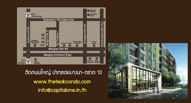 THE TEAK BANGNA-TRAD ที่ตั้งโครงการ : ซอยบางนา-ตราด 13 (ซอยเชลียง 1/1) ถนนบางนา-ตราด (ฝั่งขาออก) กม.2 แขวงบางนา เขตบางนา กรุงเทพมหานคร ห่างจากถนนบางนา-ตราด ประมาณ 20 เมตร ประเภทโครงการ: คอนโดมิเนียม ตกแต่งพร้อมเฟอร์นิเจอร์ สูง 7 ชั้น จำนวน 1 อาคาร เนื้อที่โครงการ: 3 งาน 31 ตารางวา ประเภทห้อง: 1-2 ห้องนอน พื้นที่ใช้สอย: 22.5-75.5 ตารางเมตร จำนวนห้อง: ประมาณ 79 ยูนิต คาดว่าก่อสร้างแล้วเสร็จ: ประมาณ ธันวาคม พ.ศ. 2556 ราคาเริ่มต้น: 1.25 ล้านบาท เจ้าของโครงการ: บริษัท แอล เค เอช ดีเวลลอปเม้นท์ จำกัด ขาย THE TEAK BANGNA-TRAD จอง+ทำสัญญาวันนี้ ฟรี Iphone 5s